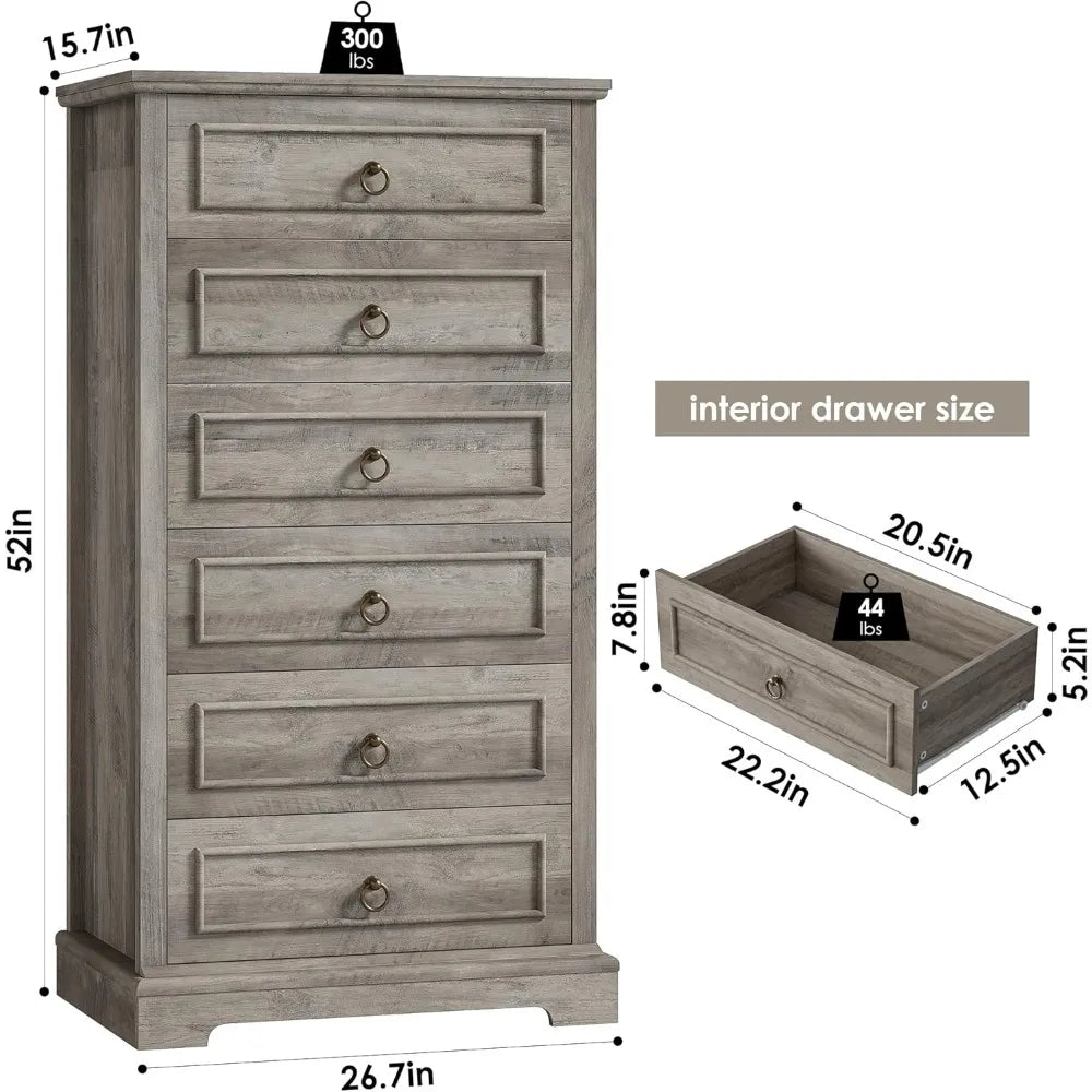 Farmhouse Vertical Chest of 6 Drawers for Bedroom, 52" Tall