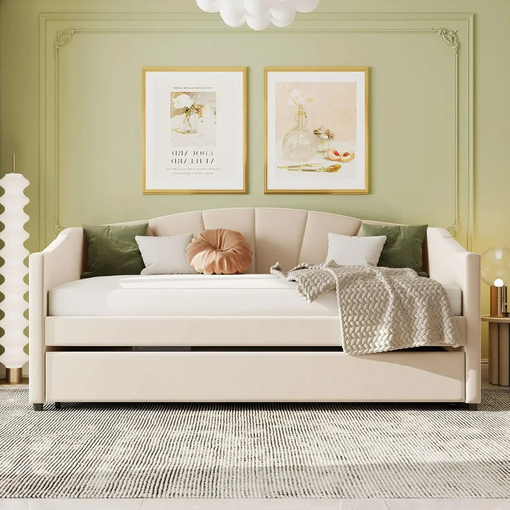 Velvet Daybed with Trundle and Wooden Slat Support,